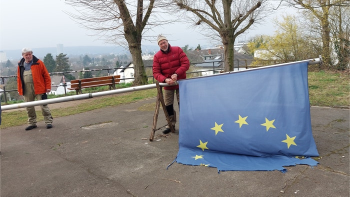 Vor einigen Jahren schenkte der Europa-Abgeordnete Axel Voss unserem Bürgerverein eine Europa-Fahne, die seither auf dem Finkenberg wehte. Wind und Wetter haben gute Arbeit getan: die Fahne franste aus, halbierte sich und wurde unansehnlich.